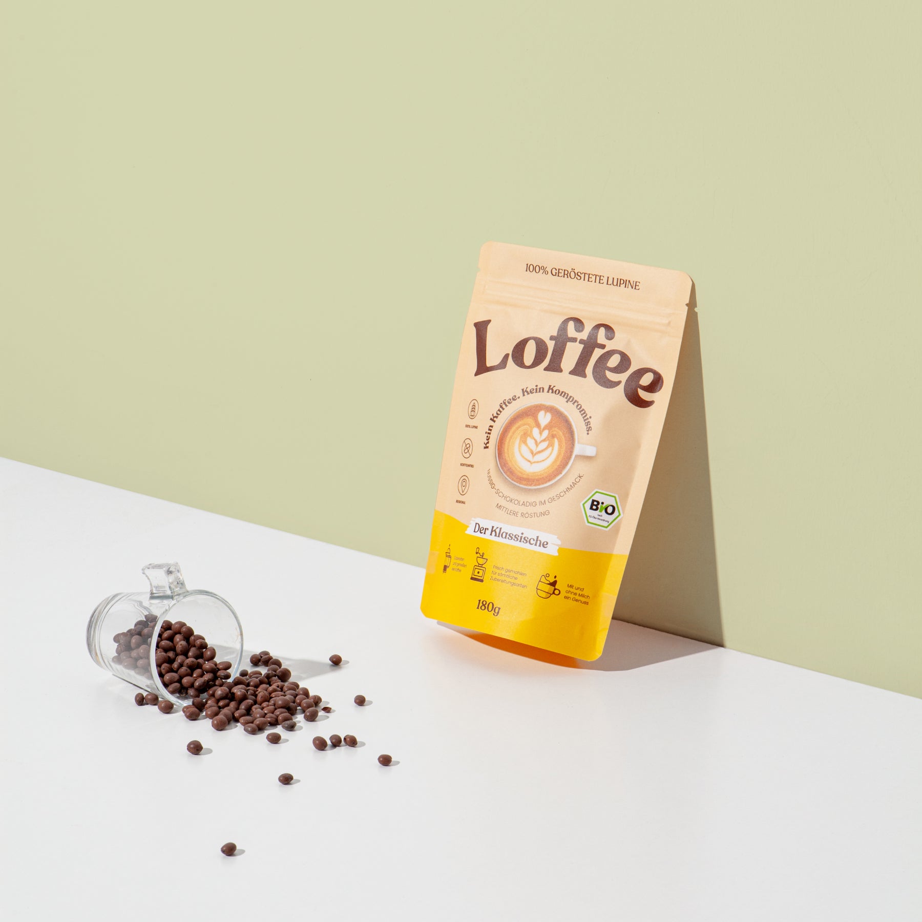 Ganze Bohne: Wir verwenden eine besondere Lupinensorte, die kleiner ist als andere. Damit können die ganzen Bohnen in jeder Mühle vermahlen werden.